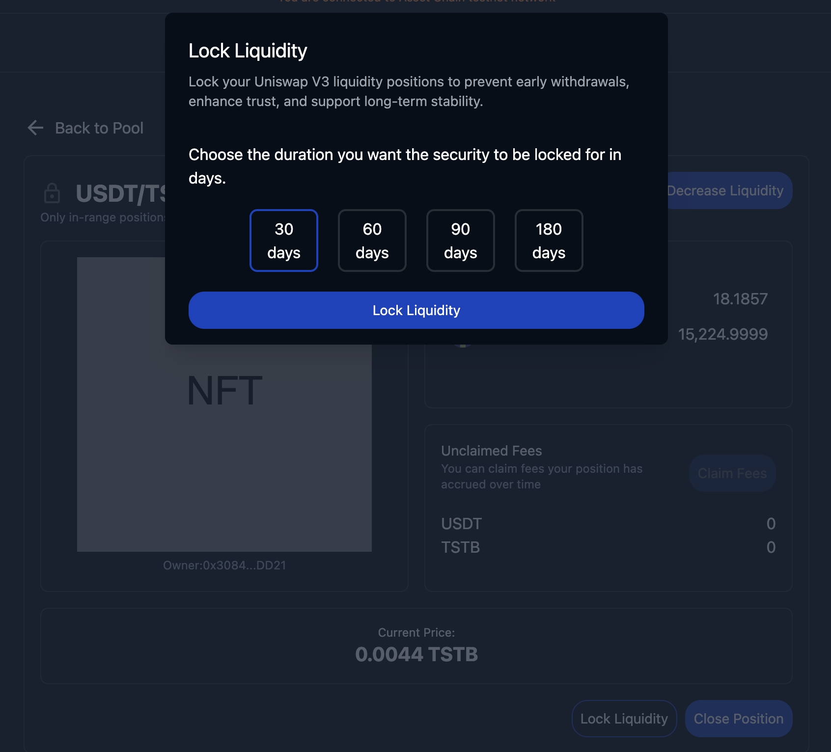When you provide liquidity on AssetChain Swap application, you also have the option to lock that liquidity position for a period of time. In this period of time, you don't have the permission to perform any actions on your liquidity position.