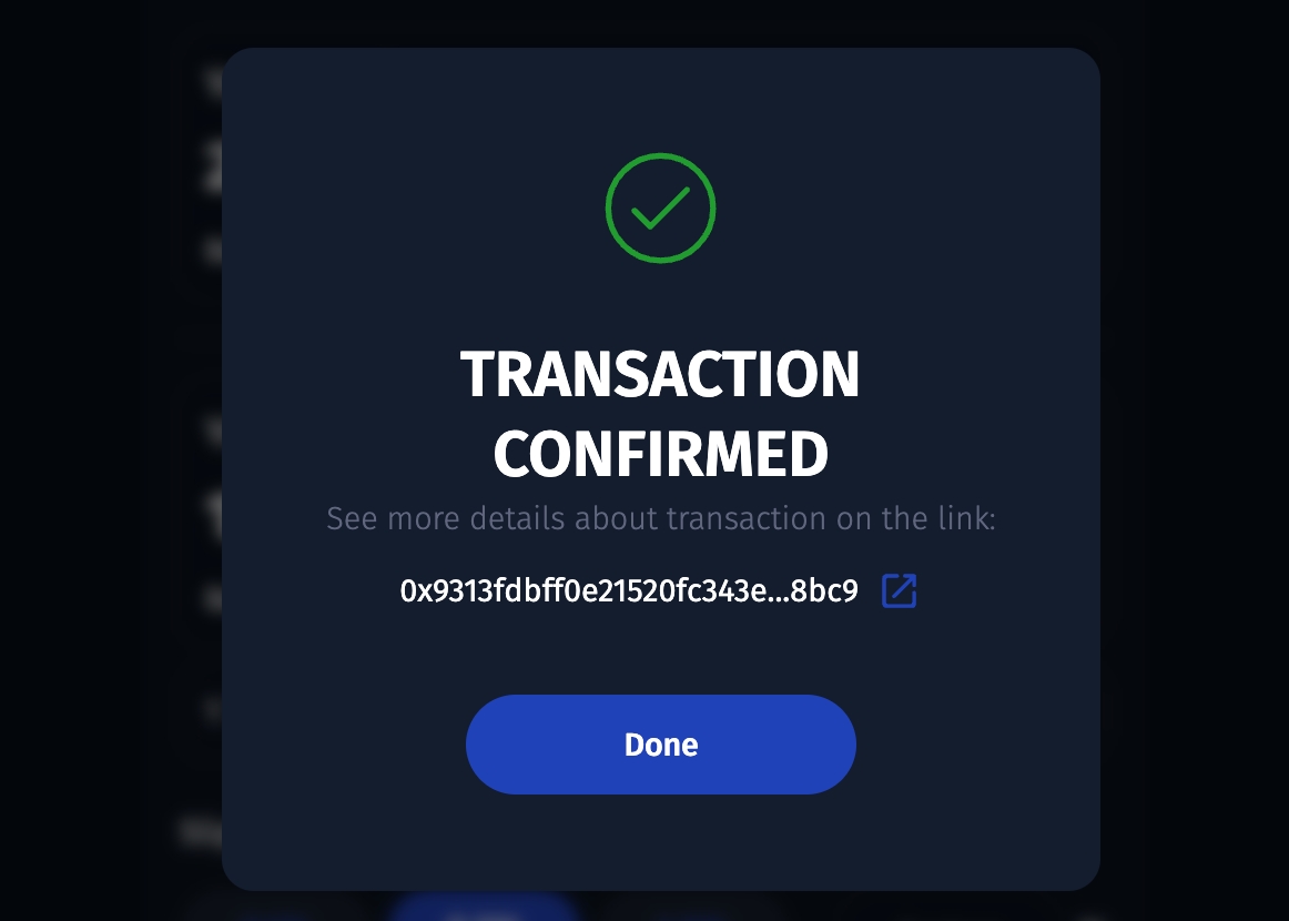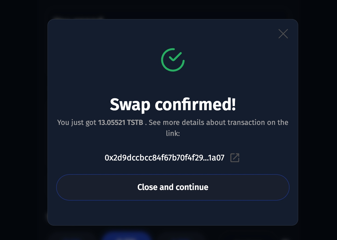 - Click on the swap button, and sign the transaction. You should see a modal similar to the one below, if successful.